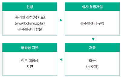 통장을 개설한 아동이 매월 저축하면 국가(지자체)가 월10만원