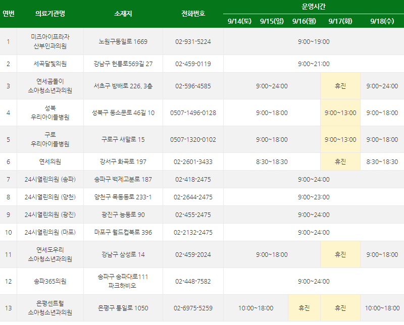 추석연휴때도 우리 아이가 아파서 갔을때 갈수 있는 병원을 알아보겠습니다.