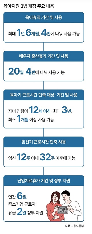 난임 치료를 위한 휴가가 기존 3일에서 6일로 확대되었으며, 유급 기간도 2일로