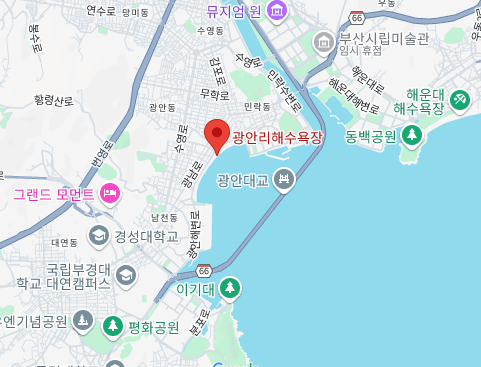 -일반버스: 28,41,42,62,83,83-1,108 (광안리해수욕장 정류장 하차)